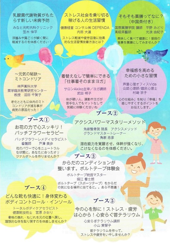 楽しくすぐに役立つ様々な講演と、実際に未病予防を体感していただく無料体験ブース、気になる血管年齢や糖化度測定もございます。